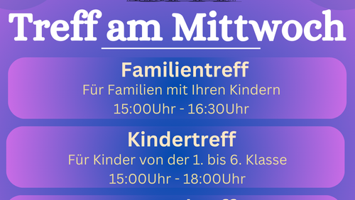 In der Zeit von 15:00 -!6:30 Uhr sind Familien mit Kindern willkommen, gleichzeitig findet immer noch der Kindertreff bis 18:00 Uhr für Kinder bis einschließlich der sechsten Klasse statt.